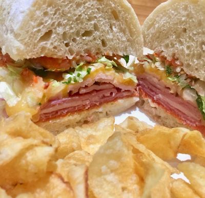 smoked ham, salami, pepperoni, cheddar, pepper jack & lettuce with homemade spicy-tomato-pepperoncini spread on ciabatta roll